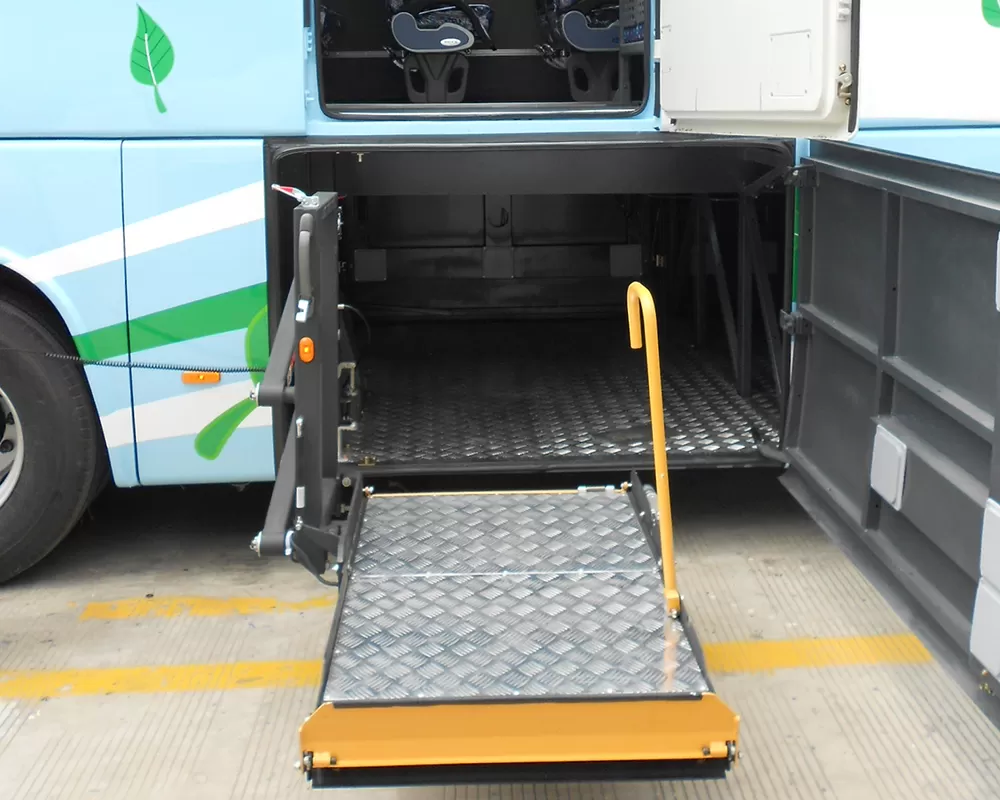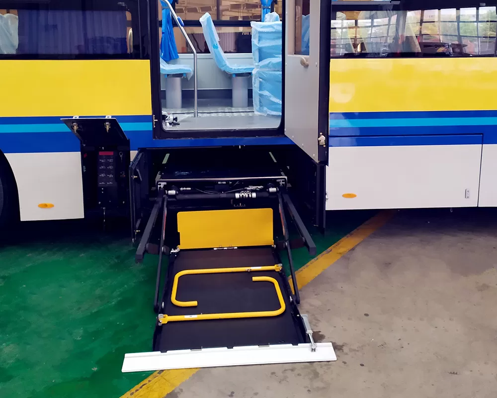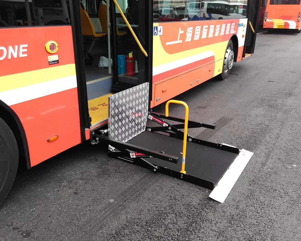 Después de que el vehículo se detiene, abra la puerta, el ascensor se despliega desde el estado plegado u oculto, y la Plataforma se baja al suelo o la altura de la plataforma para facilitar la entrada de sillas de ruedas o pasajeros.