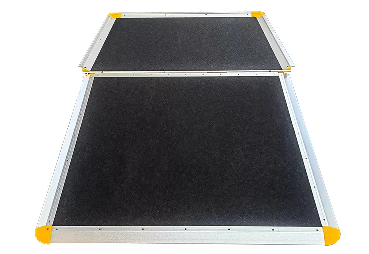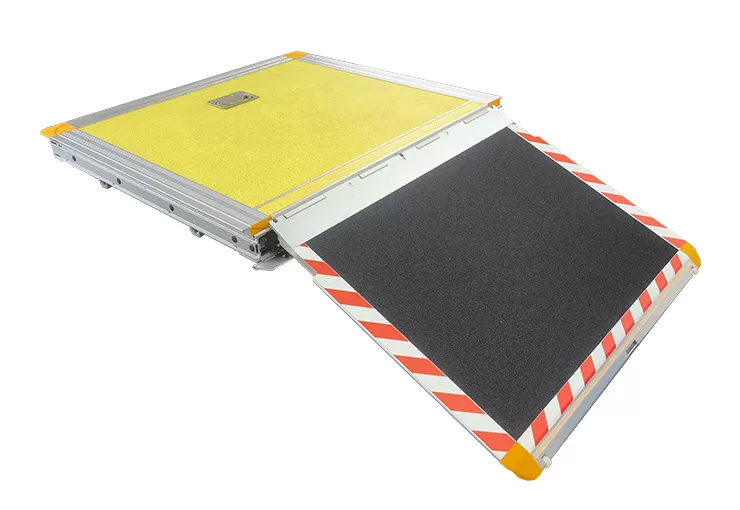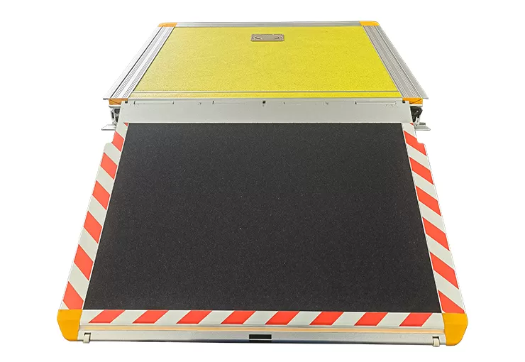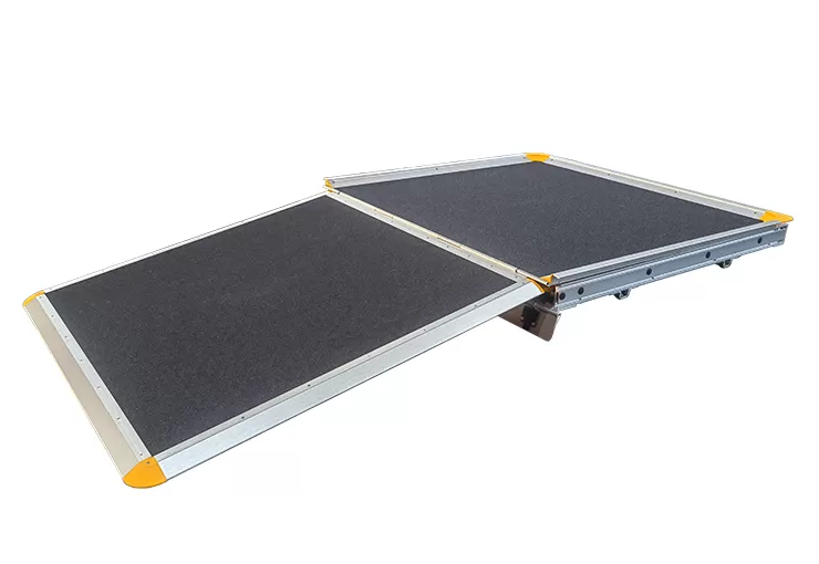 Este producto combina la rampa abatible y la rampa telescópica en una sola unidad. El extremo superior presenta una rampa de giro manual que está al nivel del piso del autobús, mientras que el extremo inferior consta de una rampa telescópica manual/eléctrica controlada por un interruptor de botón estándar instalado en el tablero. Los clientes pueden elegir entre las dos opciones en función de sus escenarios de uso. La rampa está hecha de aluminio, paneles de aluminio de nido de abeja y acero inoxidable, lo que la hace liviana y altamente resistente a la corrosión. La superficie ha sido tratada para resistencia al deslizamiento e incluye características como parada de detección de obstáculos, detección de gravedad y operación manual de emergencia. También cumple con los requisitos de la GB-13094-2017 norma "Requisitos de seguridad para estructuras de autobús"