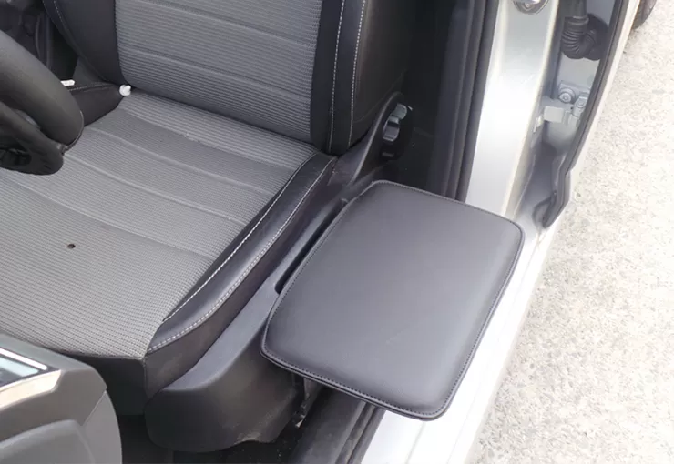 La función principal de los paneles laterales del asiento es formar un panel de transición entre el asiento del vehículo y el vehículo de silla de ruedas para facilitar la transferencia del pasajero de la silla de ruedas entre la silla de ruedas y el asiento del vehículo. Puede abrirse cuando está en uso y guardarse cuando no está en uso.