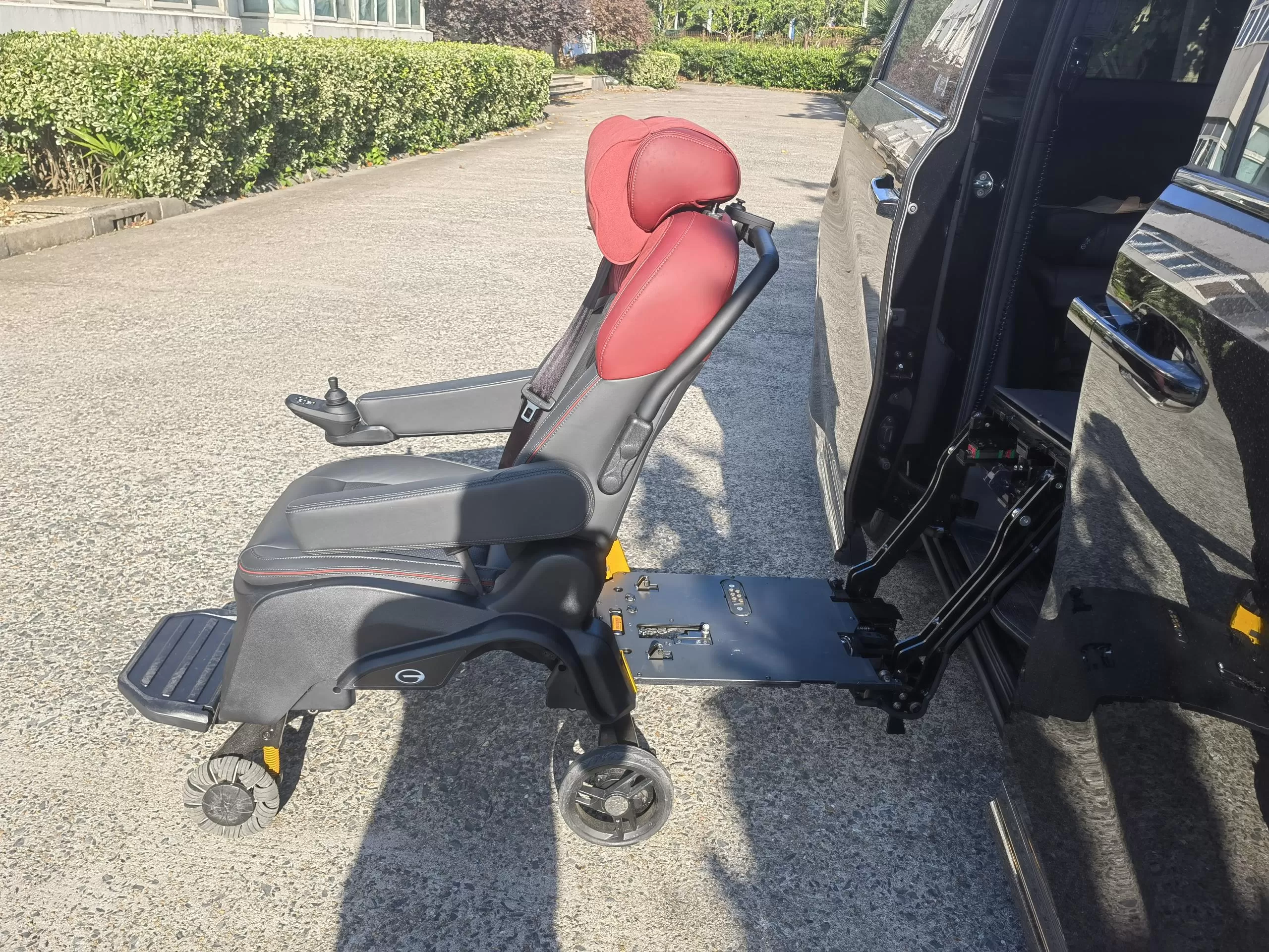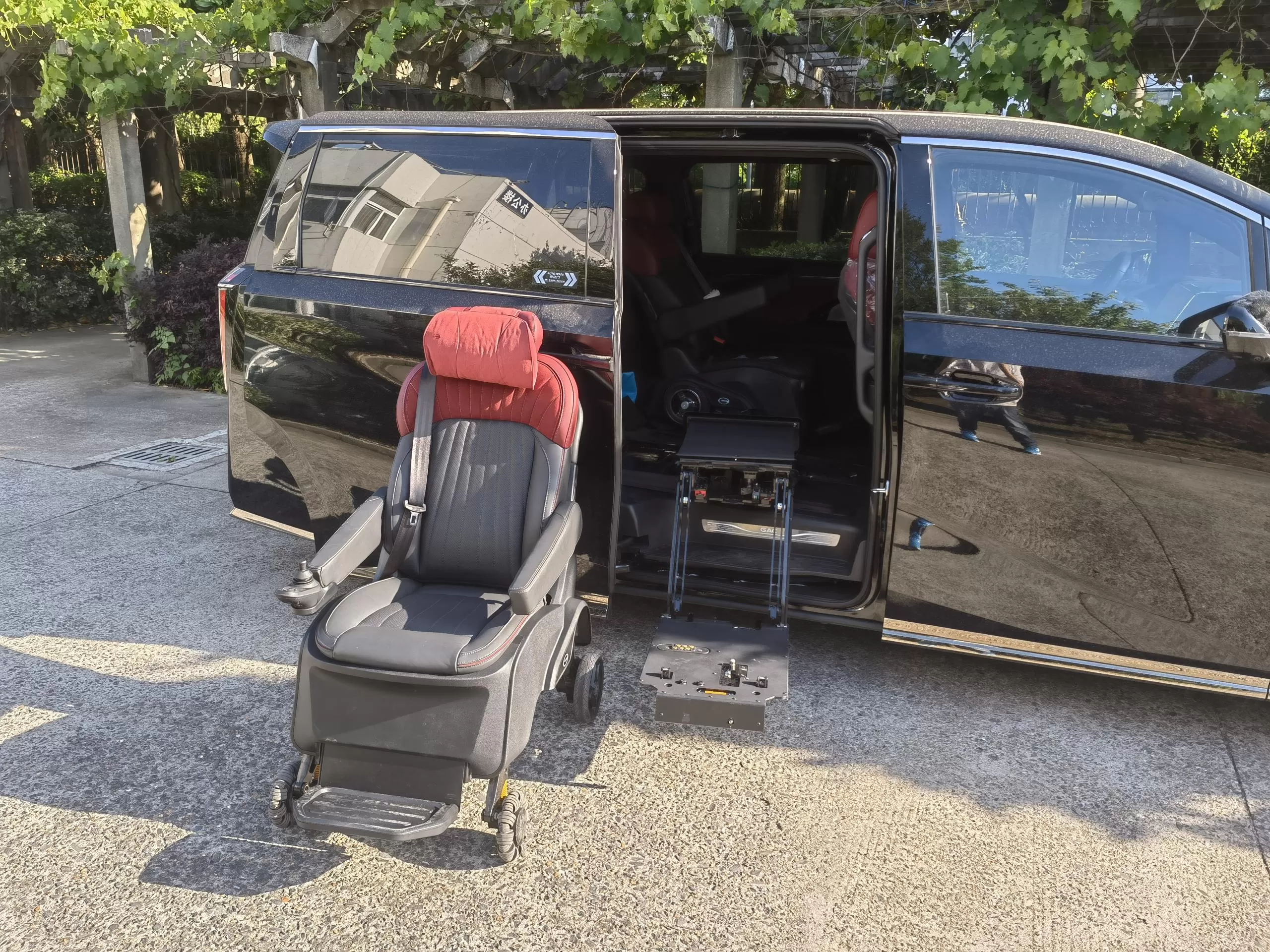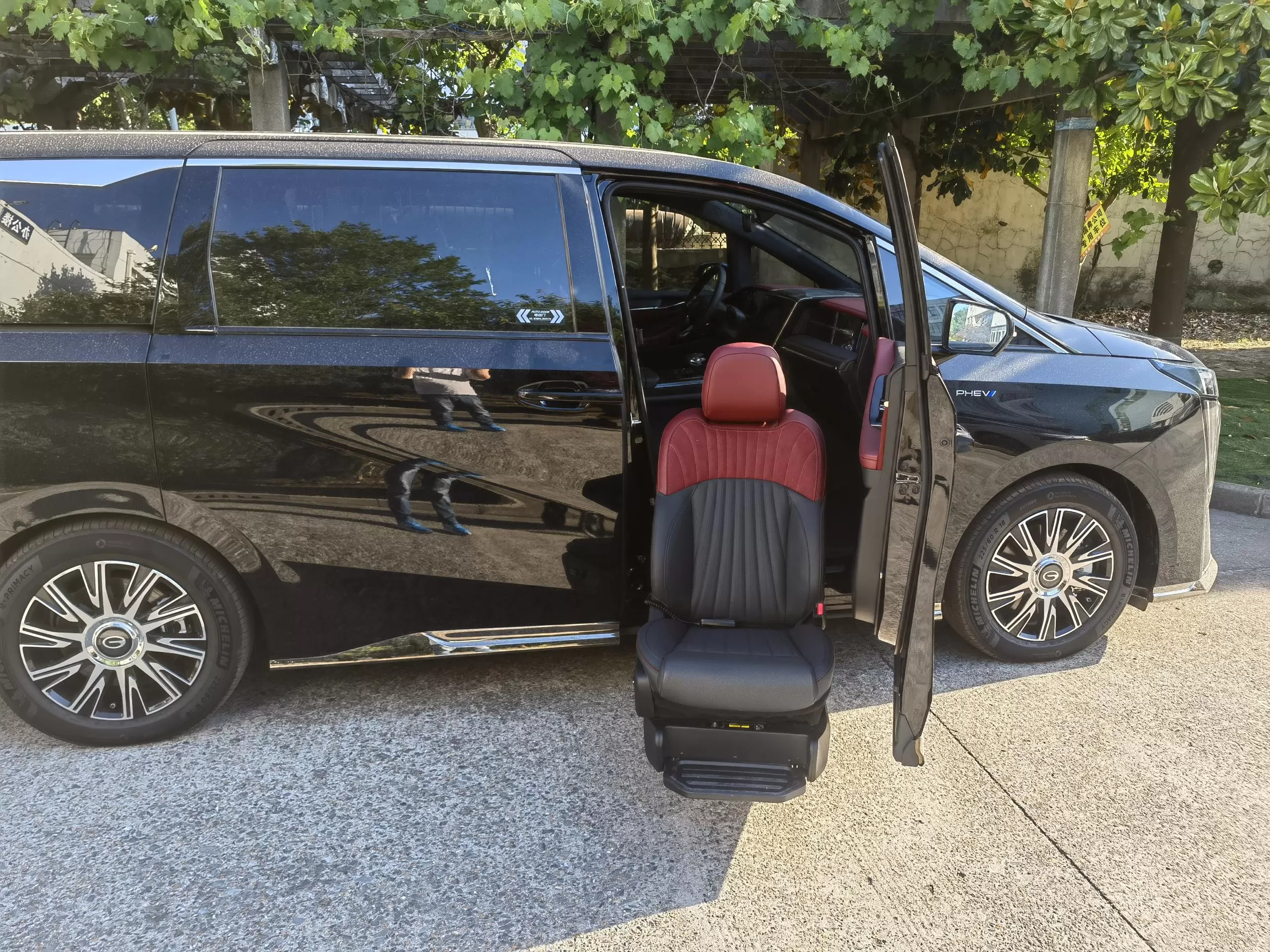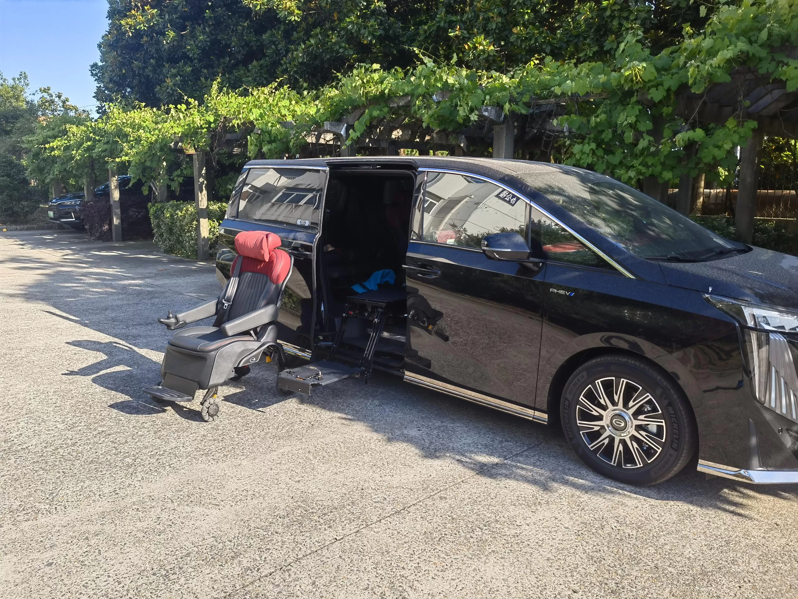 Detalles: Este nuevo E9 de energía de Trumpchi ha sido modificado con un asiento de bienestar dividido Xinder-tech en la fila central, equipado con un asiento móvil eléctrico, el mismo interior que el asiento de automóvil original, y controlado por un controlador manual con cable; el nuevo asiento giratorio V2 se ha modificado en el asiento del copiloto, Se ha modificado el asiento de seguridad original, no se ha cambiado el interior y lo controla un controlador manual con cable.
